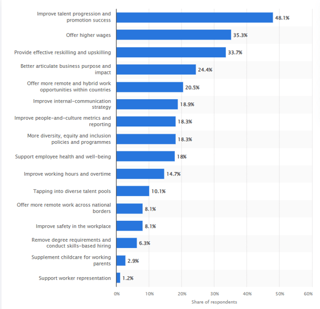 Offer upskilling programmes and retain talent. Factors such as a lack of career opportunities to organisational changes can make employees vote with their feet and resign–leaving in search of better opportunities or underperforming.