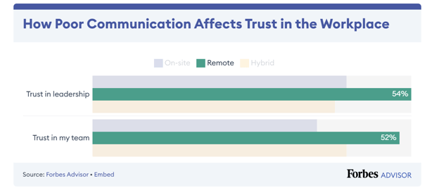 Thirdly, 45% of employees # say poor communication affects their trust in leadership and their team. For remote workers, this percentage increases to 54% for impact on trust in leadership and 52% for impact on trust in the team. This makes it challenging to build and maintain positive relationships.