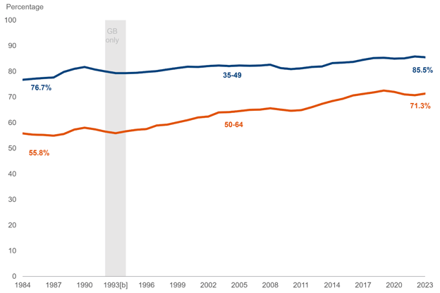 Over the past four decades, the employment rate for individuals aged 50 to 64 has shown a significant long-term increase–rising from 55.8% to 71.3%.