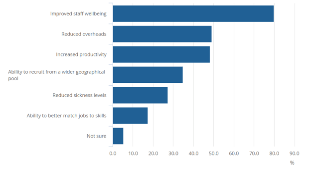 There is direct overlap in some places - improved staff wellbeing, for example - and close alignment in others (increased productivity vs quicker to complete tasks; reduced sickness levels vs improved wellbeing), but some perceived benefits are unique to employers: reduced overheads, ability to recruit form a wider geographical pool, and ability to better match jobs to skills.