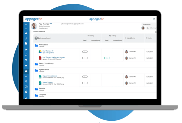 Keep track of company documents and procedures. Digital HR document management software, like Appogee HR, lets you store and share all company documents and policies from one centralised platform.